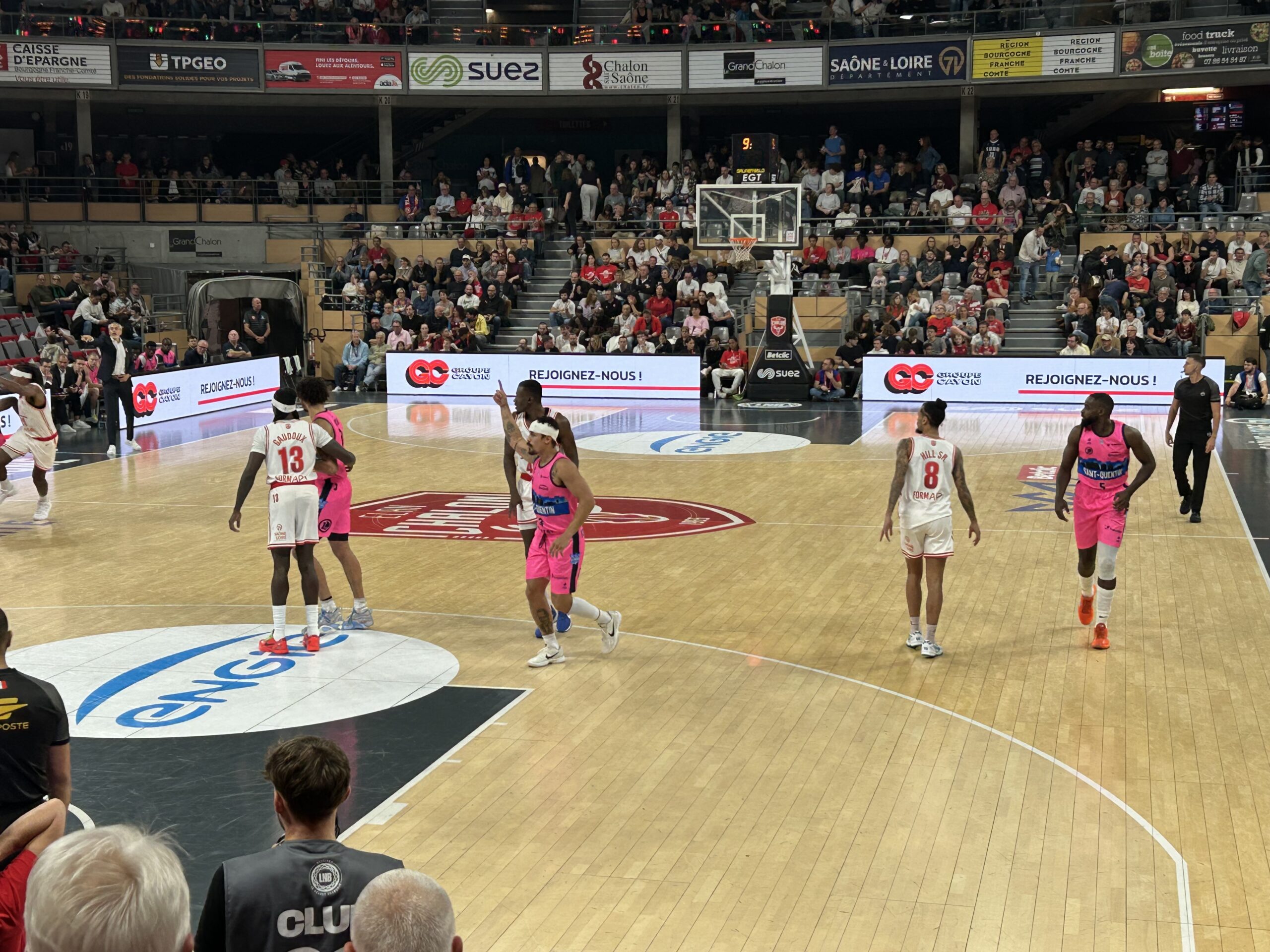 On sent les Chalonnais qui n’arrivent pas à se libérer au Colisée, une certaine frustration se fait sentir. Côté Saint-Quentin, Nick Johnson prend feu : trois points et pénétrations dévastatrices, 17 points déjà au compteur à la pause ! Mi-temps : 39-41, Saint-Quentin mène.